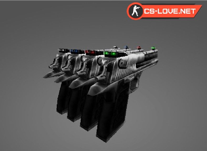 Модель оружия Glowing Deagle для CS 1.6 - очень интересная модель Deagle, у которой на целике и мушке установлены цветные огни. Всего было сделано несколько цветов огней: красный, зеленый, голубой и белый. Остальные части пистолета не изменялись, так сказать, полный сток.